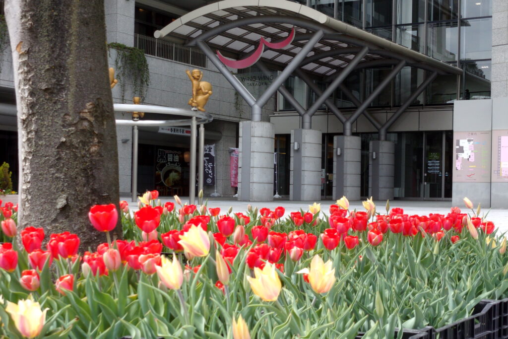 ウイング・ウイング高岡前の広場公園に、チューリップのプランターが設置されました。
